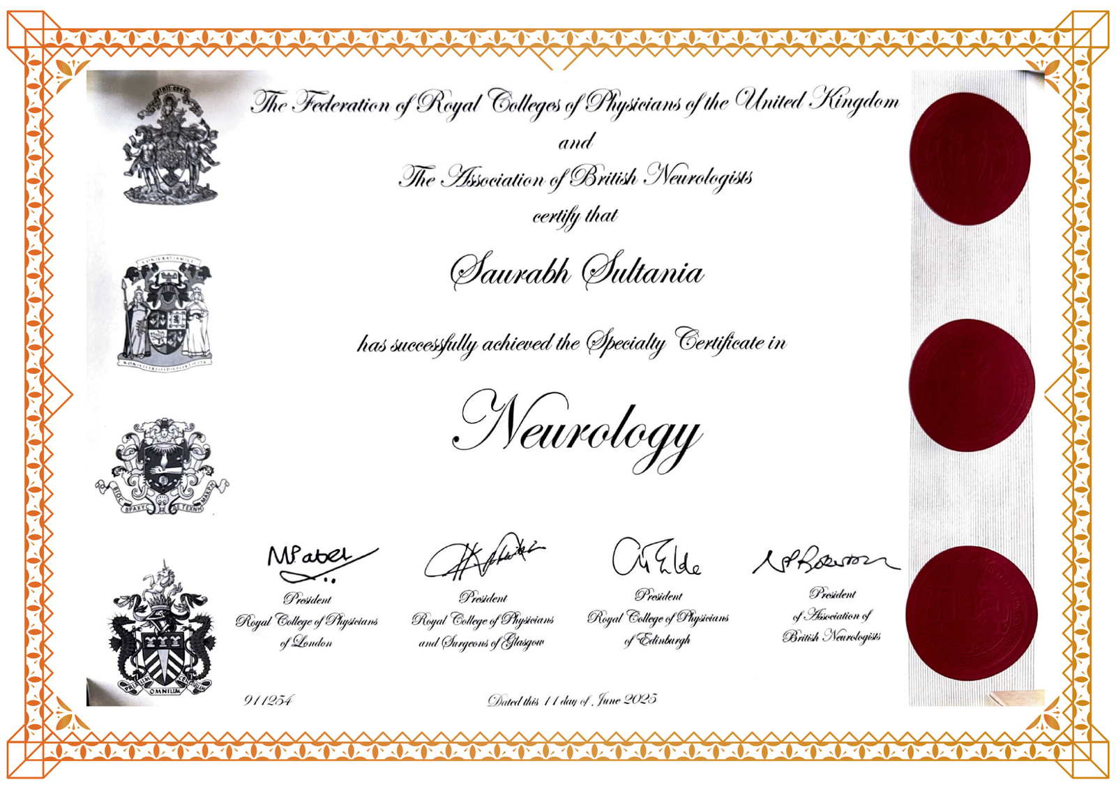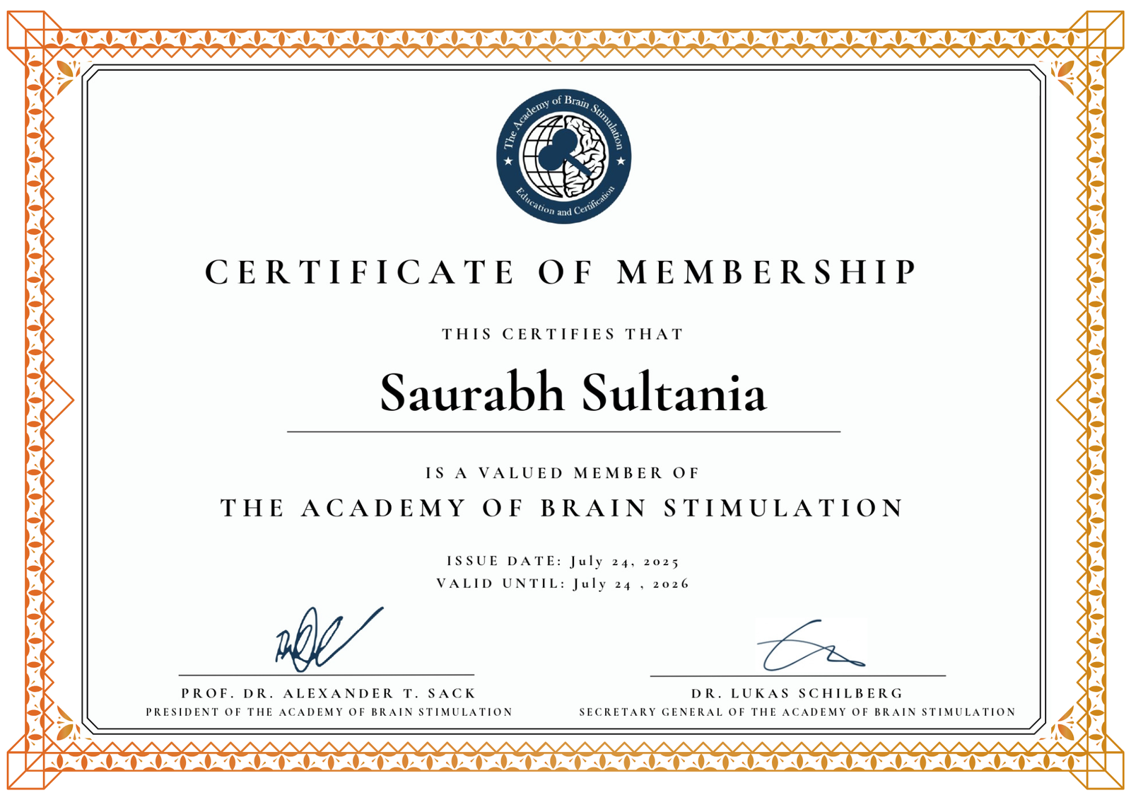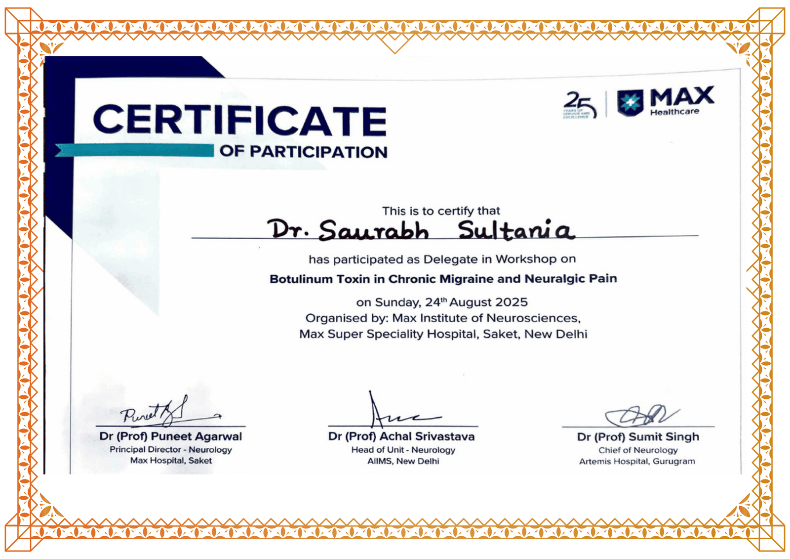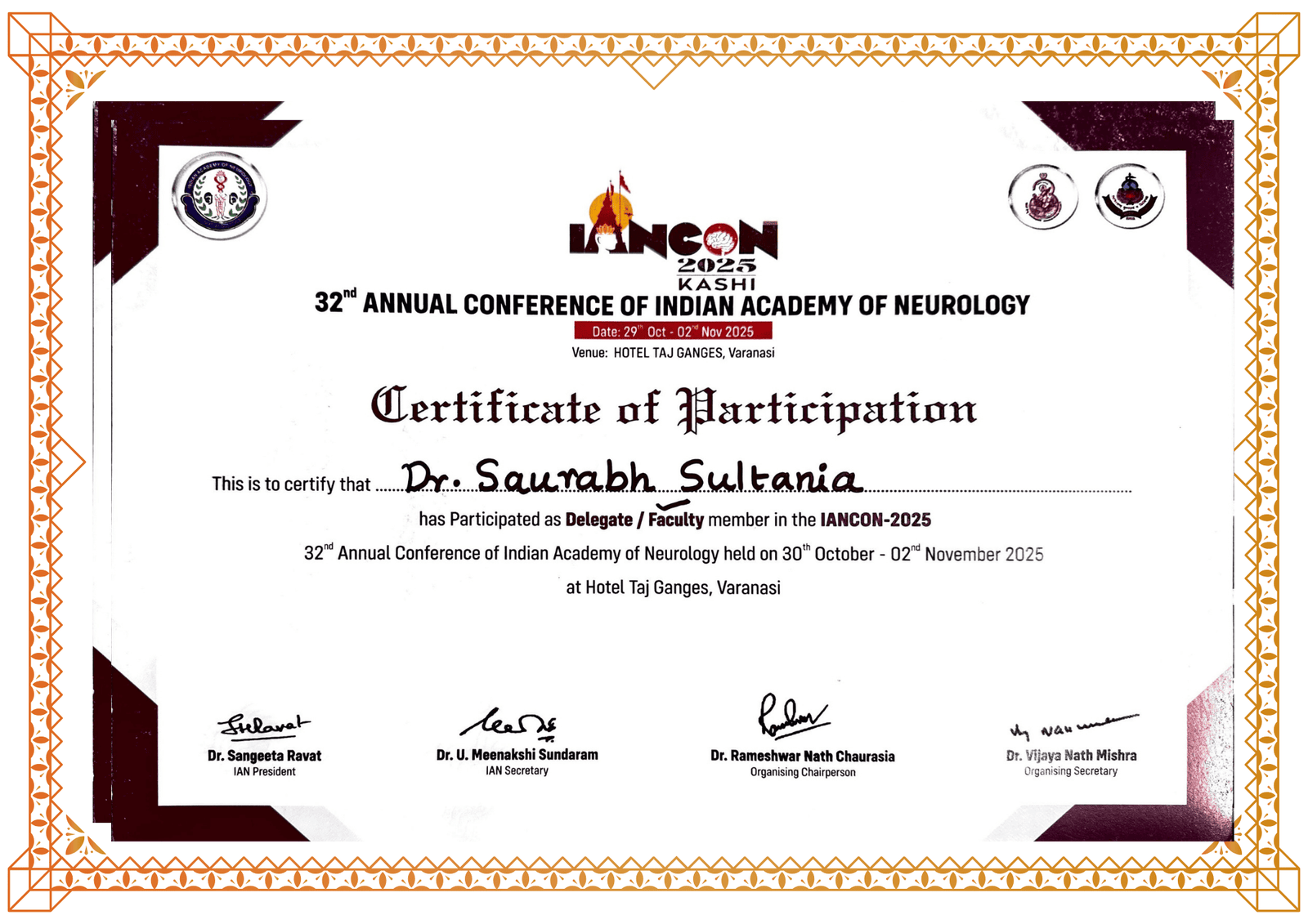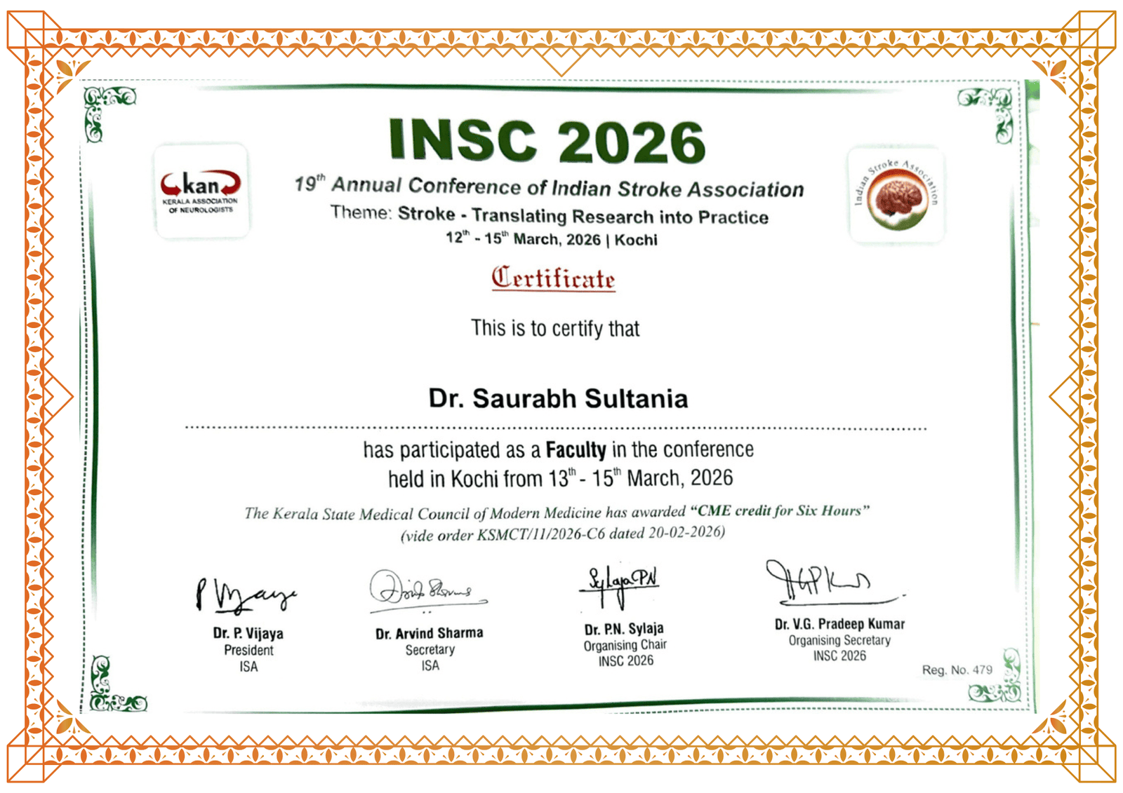 Dr. Saurabh Sultania is a highly skilled and trusted neurologist based in Faridabad, specializing in the diagnosis and management of a wide range of neurological disorders. His areas of expertise include stroke care, post-stroke neuro rehabilitation, epilepsy, vertigo, movement disorders, dementia, demyelinating disorders, and advanced therapies such as Transcranial Magnetic Stimulation (TMS) and Botox therapy.