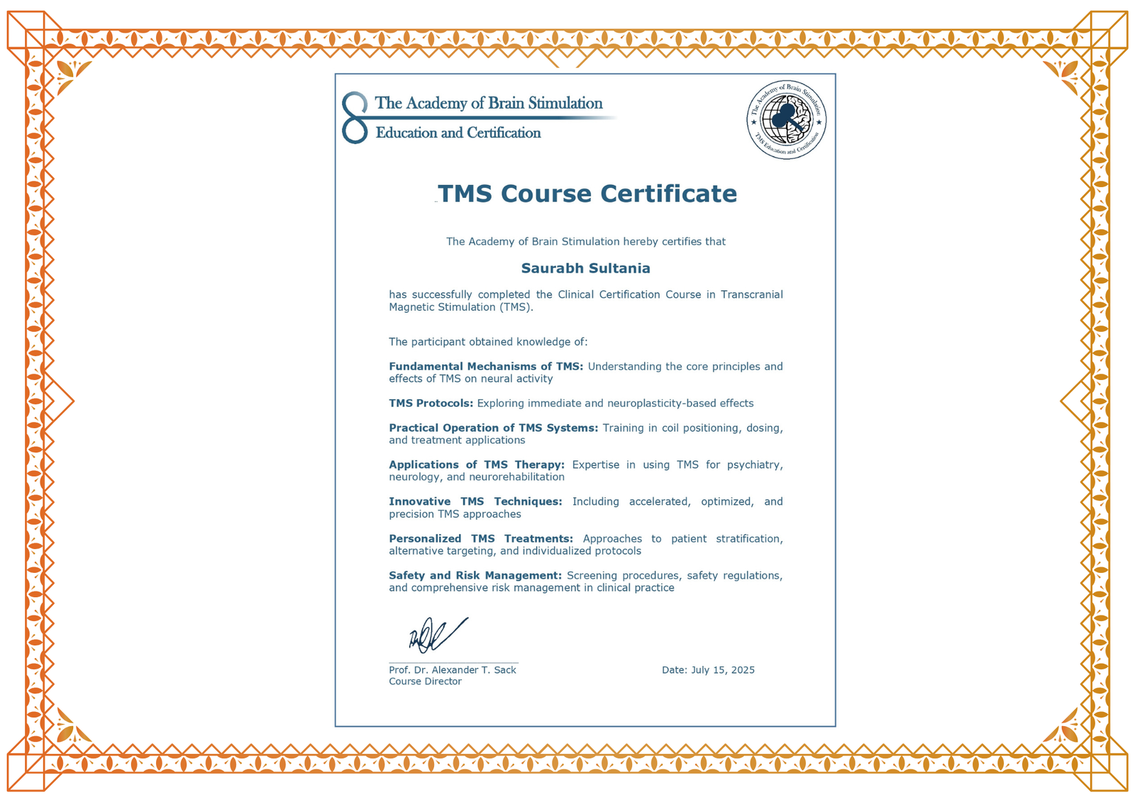Dr. Saurabh Sultania is a highly skilled and trusted neurologist based in Faridabad, specializing in the diagnosis and management of a wide range of neurological disorders. His areas of expertise include stroke care, post-stroke neuro rehabilitation, epilepsy, vertigo, movement disorders, dementia, demyelinating disorders, and advanced therapies such as Transcranial Magnetic Stimulation (TMS) and Botox therapy.